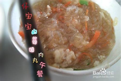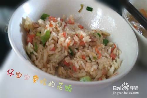 炒好的花饭要稍稍晾一会儿(炒过的米饭粒外表冷了,里面的温度还是很高的,小宝宝咀嚼的过程中会烫嘴的)。瞧,花饭配着汤粉一起吃