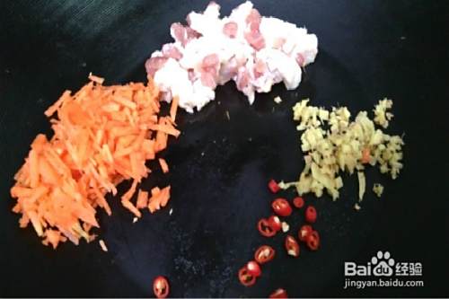 炒锅放入胡萝卜、五花肉、生姜末,干红辣椒和少许的油,小火慢慢地煎炒,直到五花肉的油渗出变成黄色。