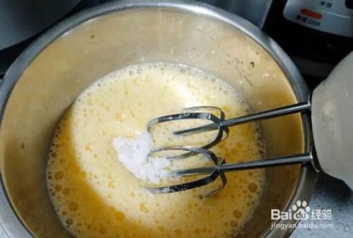 鸡蛋打入盆中,加10g白糖,盐少许,白醋几滴开始打发