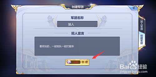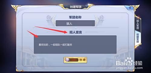 【创建军团】主页,我们接着来输入我们的军团名称,如图。