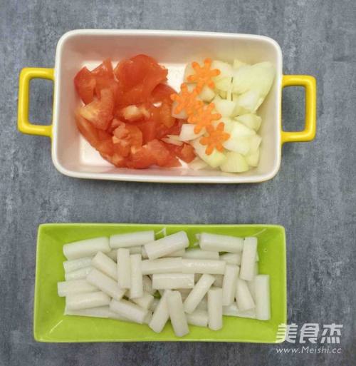 1准备主要原料,年糕条分成四段,用开水煮熟备用