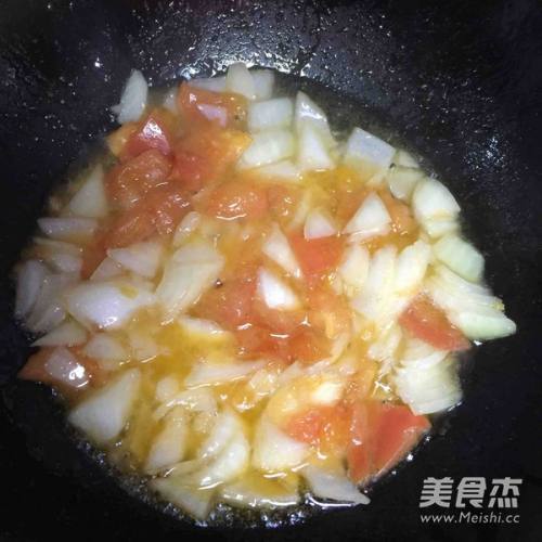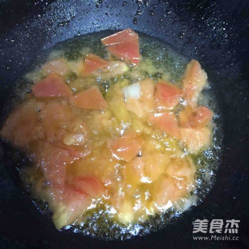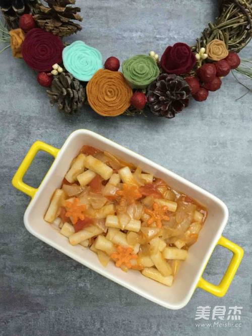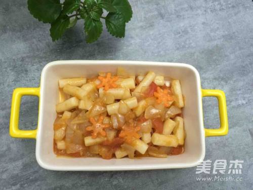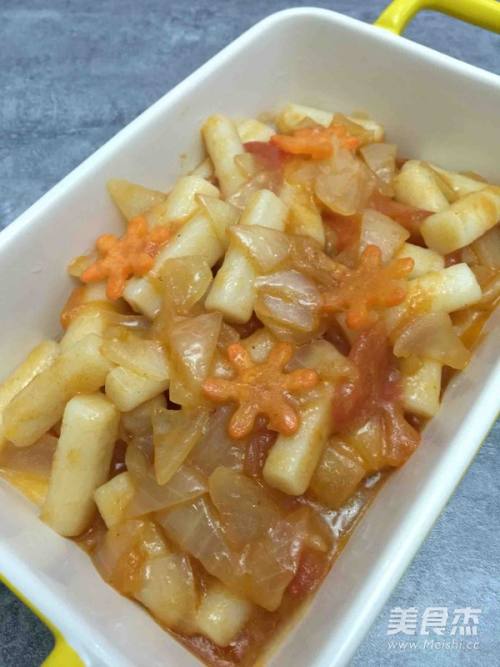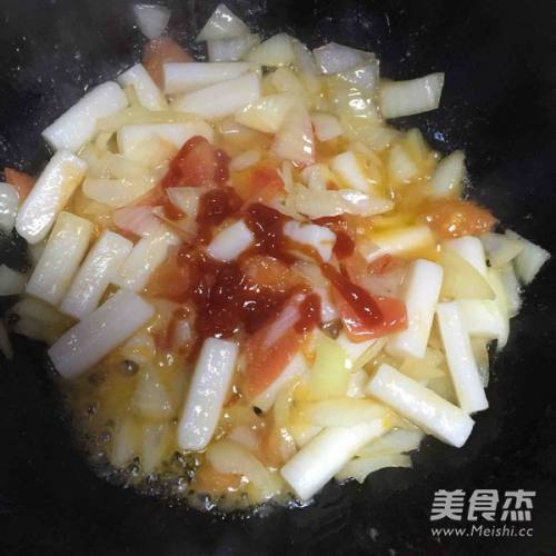 5放入煮熟的年糕条、胡萝卜片、番茄酱、盐,白砂糖,翻炒几分钟即可