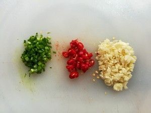 葱花只要叶子部分切成小段,辣椒切小圆圈,蒜米去皮切成小颗粒。