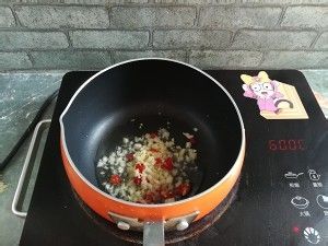 烧热油锅后,放入食用油,蒜米和辣椒煸出香味。