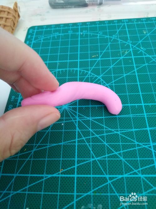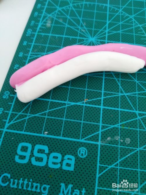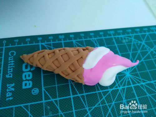 下面制作上端的冰激凌部分,将粉色粘土和白色粘土搓成粗粗的长条,然后粘在一起(这里的土非常软,刚好适合做冰激凌)