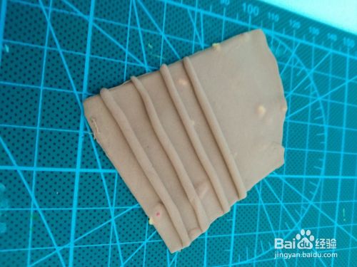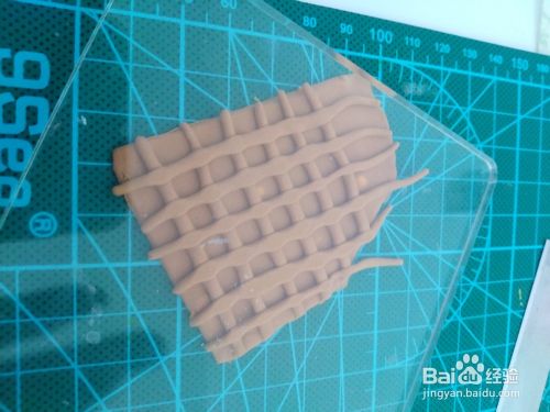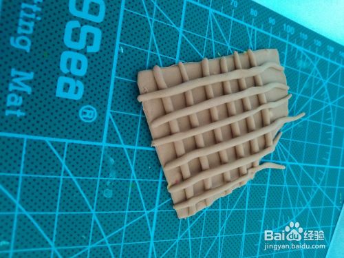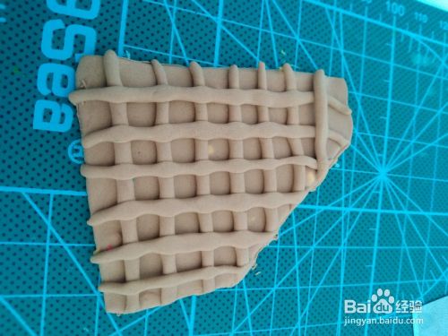 将搓好的细长条按图示一条一条排列粘在饼上,顺着一个方向贴完后,再沿垂直方向粘另一排的长条,都贴完后用压泥板稍压一下,使其贴紧