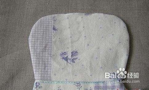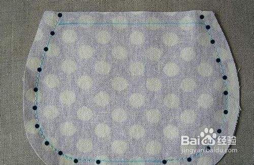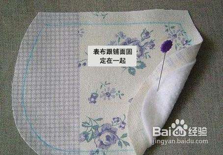 包盖布料,也将表布烫上铺棉,跟里布沿图中所示,缝合,剪掉多余部分。