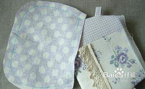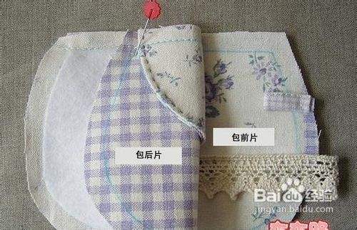 花边跟挂绳固定在包包表布的合适位置,固定好。