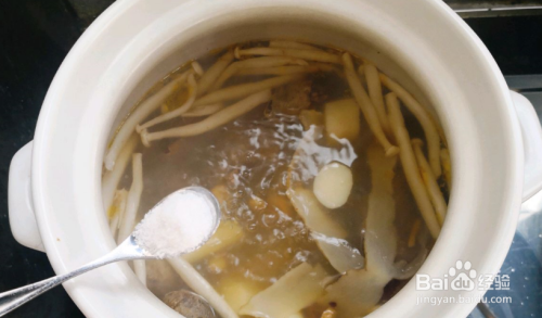 煲30分钟后放入白玉菇和山药,转大火,水开后再转小火继续煲30分钟,关火前加盐调味即可出锅