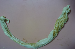 将油酥料在薄饼上抹平,用刮板在上面划出多个横条
