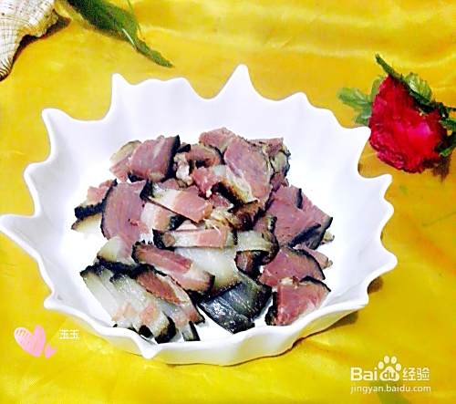腊肉煮熟后再用冷水冲一下,再切成薄片。