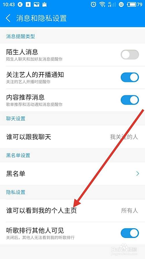 进入消息与隐私设置页面,点击“谁可以看到我的个人主页”,系统默认是所有人可以查看的。
