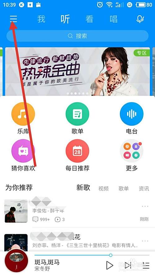 打开酷狗首页,点击左上角的三条横杠,如下图所示: