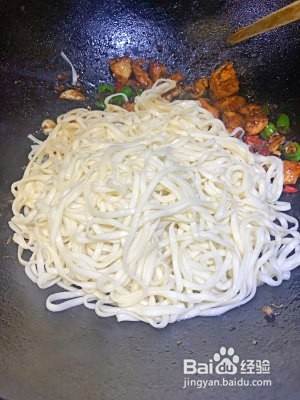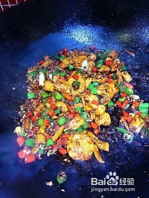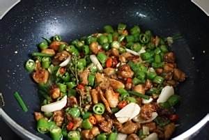 放葱姜蒜炒香放入鸡肉煎炒至熟,再放入青线椒和小米椒炒至均匀。