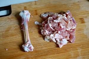 鸡腿剔骨切成小块,放几片生姜,一勺料酒,一勺生抽