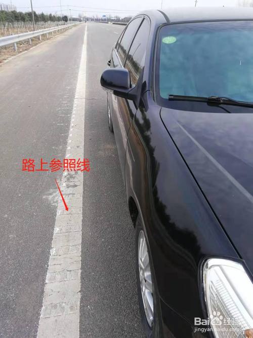 身子保持驾驶状态不动,眼睛从车内望出去,找到汽车左侧雨刮器上凸出部分的最高点在白色参照线上的落地点。记准这个落地点。
