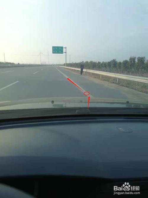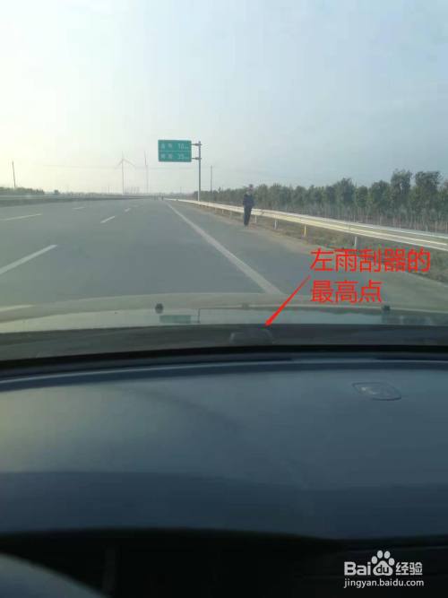 上车,坐在汽车的驾驶椅子上,找到汽车左侧雨刮器上凸出部分的最高点。这个点在车内最容易看到。