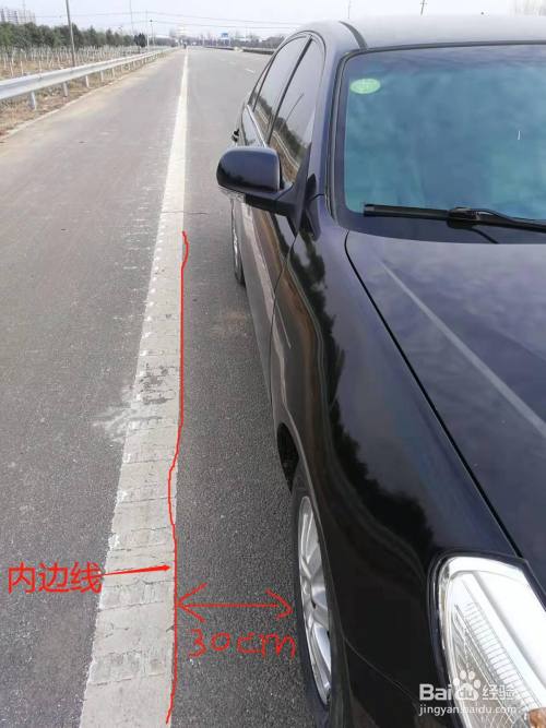 让汽车左侧雨刮器上凸出部分的最高点沿着它的落地点,在白色的参考线上向前移动。这样,汽车就能与右侧路边线保持30公分的安全距离。