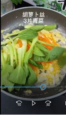 然后我们打入两个鸡蛋炒熟放胡萝卜丝青菜炒至断生。
