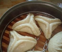 和好的面块切成大小相等的小面块,把小面块擀成圆形面皮。逐个把糖馅放入面皮中间,包成三角形。并摆放在蒸屉上。