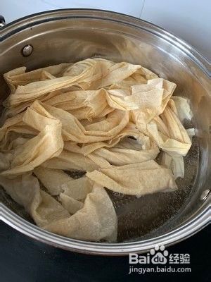 半锅水冒泡时放入干豆皮,我煮了五分钟(也可以热水盖盖子闷十分钟,效果一样)