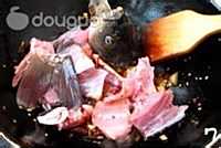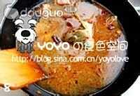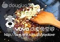 然后在锅中,继续加入郫县豆瓣酱,把油烧成红色。在烧出红油的锅中,加入姜末、蒜末、八角、桂皮,一起翻炒爆香。