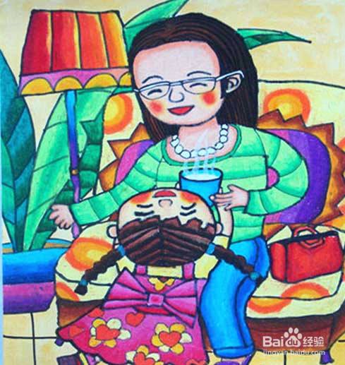 画上母女二人,小女孩手持一束鲜花,送给自己的妈妈!