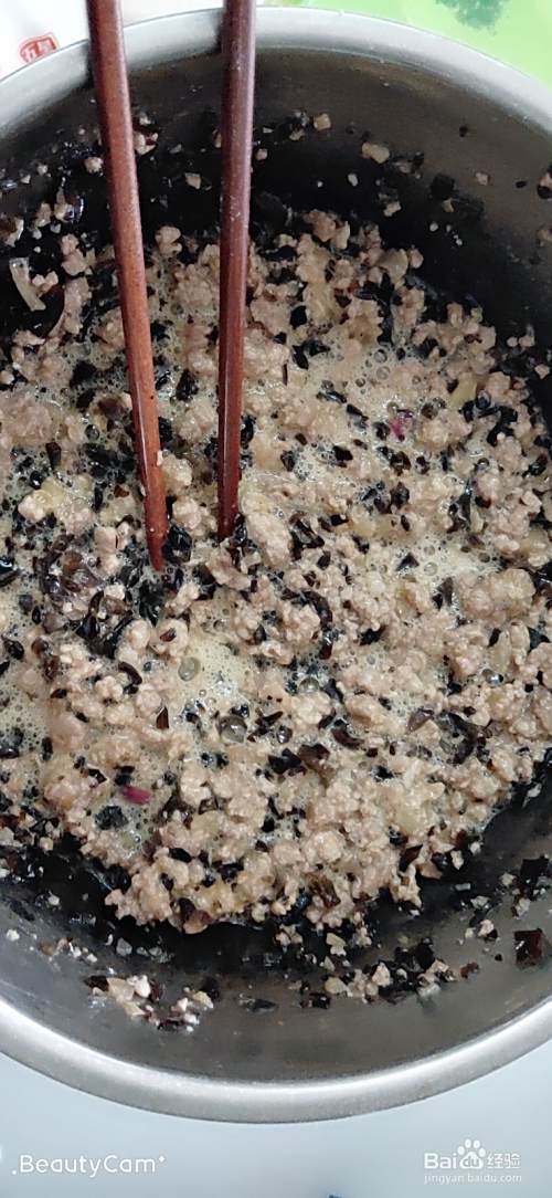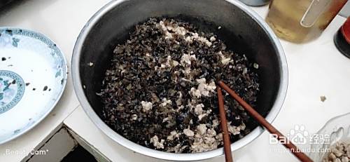 把鸡蛋和木耳末瘦肉末一起搅拌匀即可。饺子馅就算完工了。