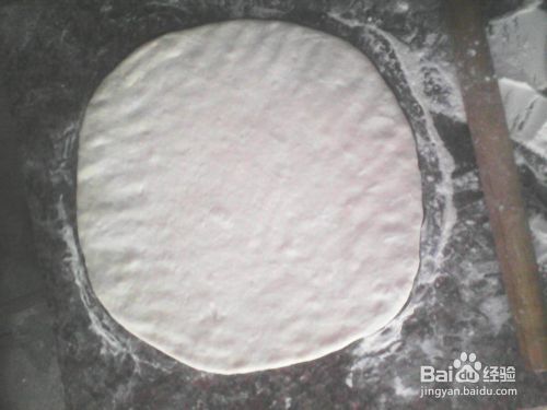 用擀面杖擀成圆形薄饼,饼面抹上花生油,加入适量的盐,用手卷成圆形,用擀面杖擀成薄饼。