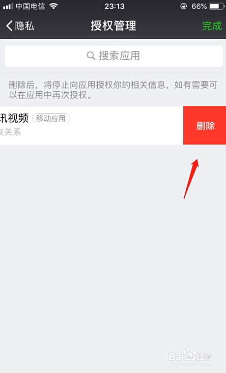 如果想解除哪个应用的绑定,点击该应用那里的红色减号按钮,会出现一个删除按钮。点击删除按钮。