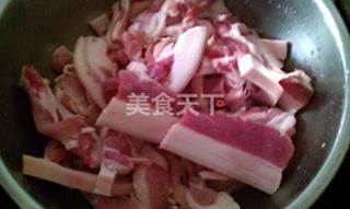 把五花肉切成薄厚均匀的肉片,大约6毫米厚,6厘米宽