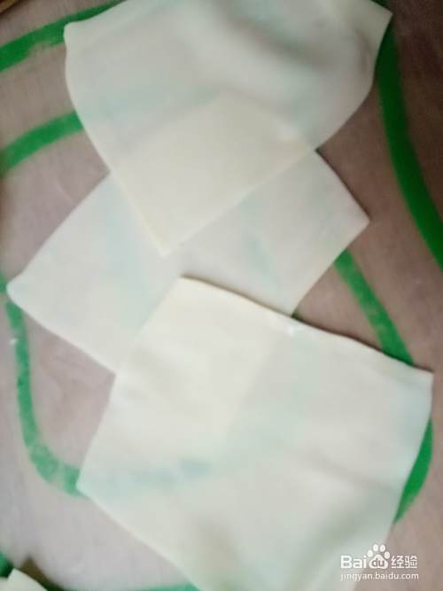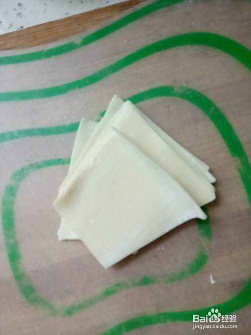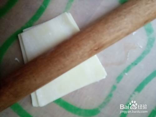 几张饺子皮放叠一起,用擀面杖把饺子皮擀压薄一点,然后在一张一张分开。