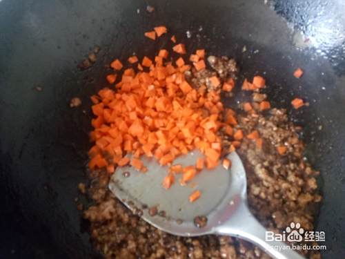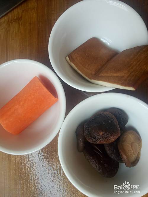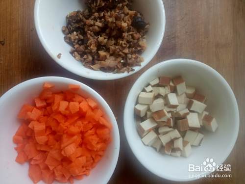 接着把胡萝卜、豆干切粒。香菇、姜切末。瘦肉剁成肉泥。