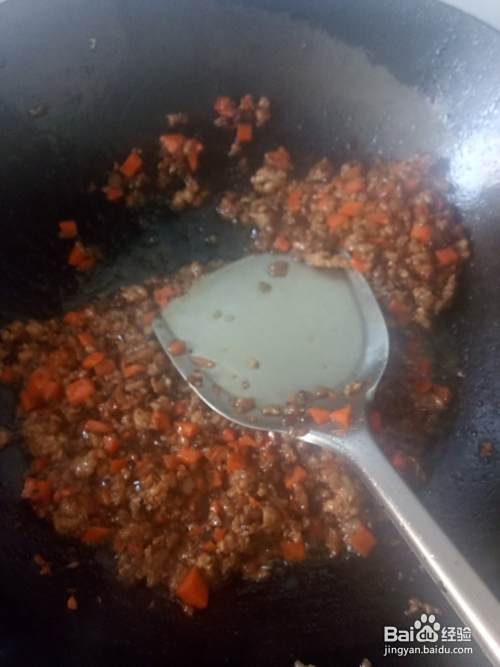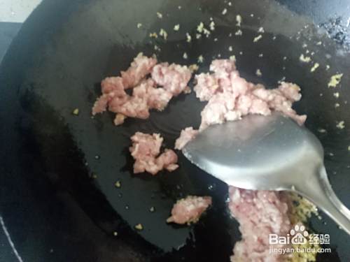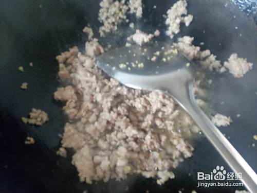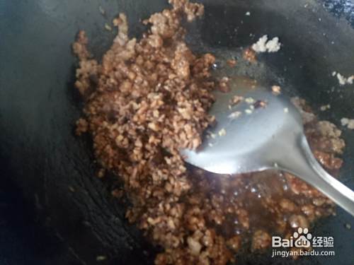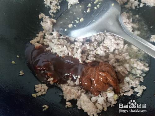炒锅内在加多一点油,放入姜末炒香,接着倒入肉糜,肉糜都炒熟后小火加入2勺甜面酱、1勺黄豆酱然后翻炒均匀,炸出香味。