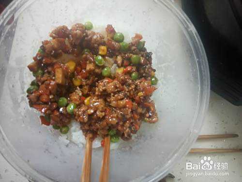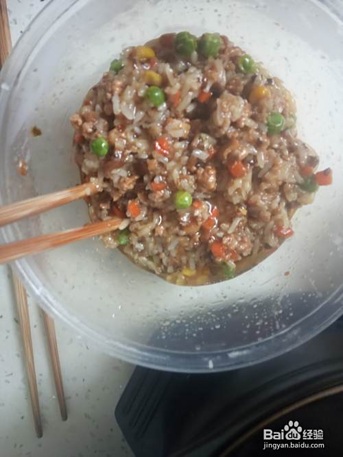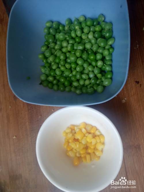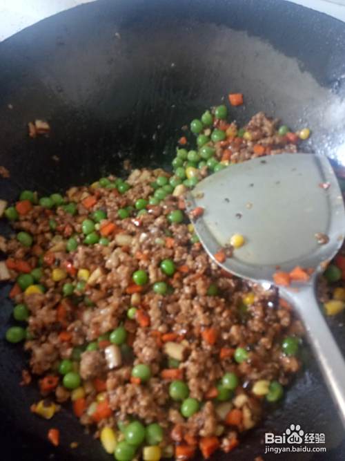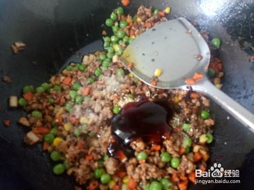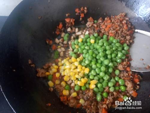 接下来的顺序就是,先加胡萝卜粒翻炒均匀后加豌豆和玉米粒,再次翻炒均匀加适量盐、少许南德、2勺耗油,少许鸡精,翻炒均匀炒一会就可以装在碗里了。
