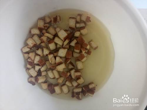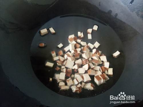 炒锅内加油,把豆干粒倒进去炸一下,表面有点焦就可以装在碗中,等会用。