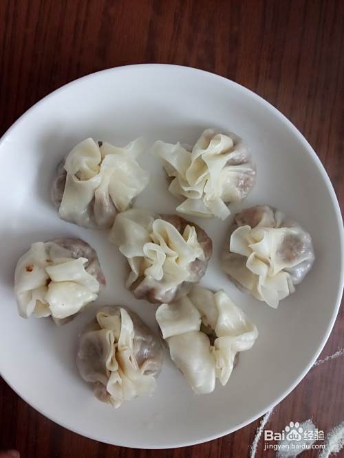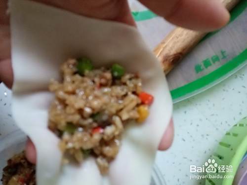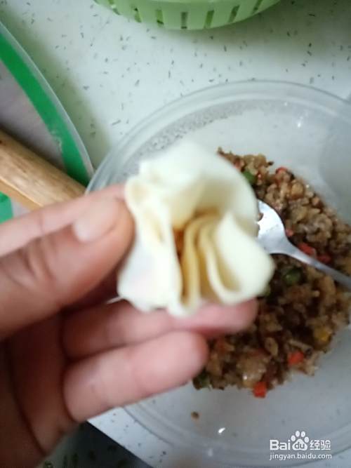 等馅凉了以后就可以包烧麦了,把馅放在擀薄的饺子皮中间,把边上的皮往中间捏一下就好,不需要像包包子那样封口。