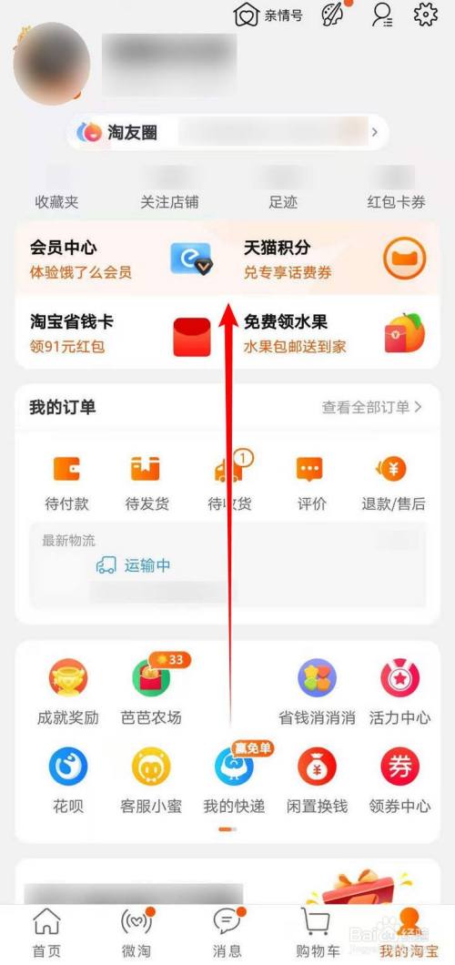 进入我的淘宝页面,主要内容除用户基本信息外,就是各种服务入口,上滑页面;
