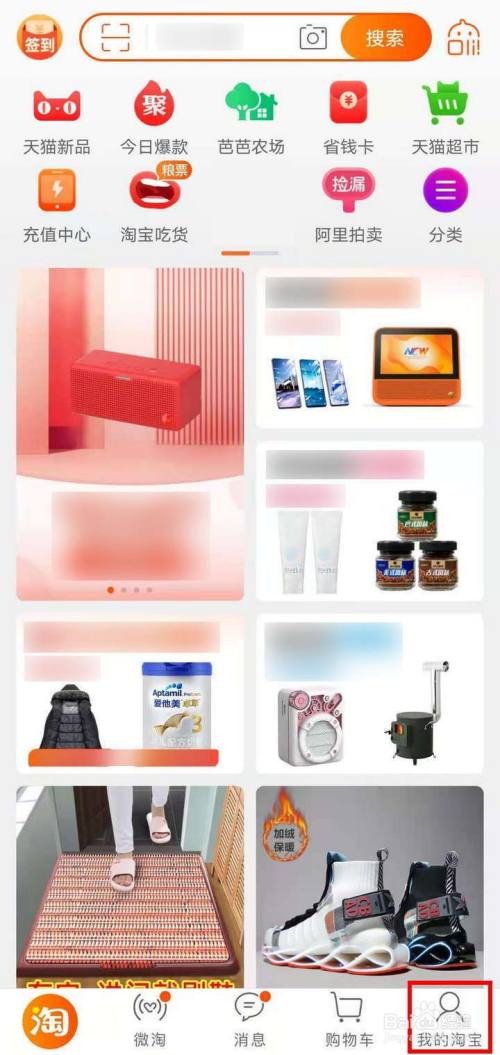 打开双11的手机淘宝APP,进入淘宝首页,上方是业务入口,下方是推荐商品,点击右下角我的淘宝;