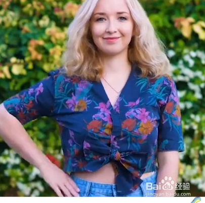 二,把花衬衫减掉腰身两边,再减去后面多余的部分打上蝴蝶结,就是一件露脐装。