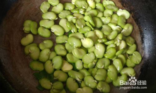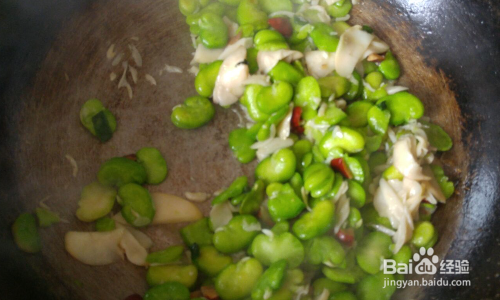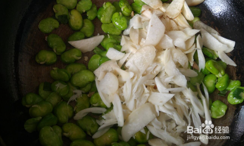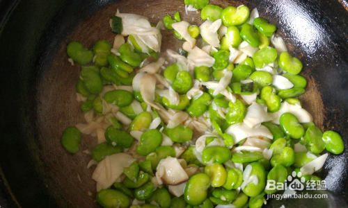 蚕豆变色的时候,再将准备好的菇类放入锅中一起进行翻炒。