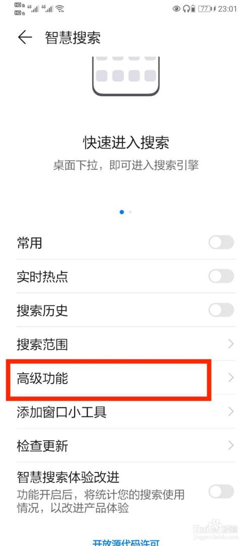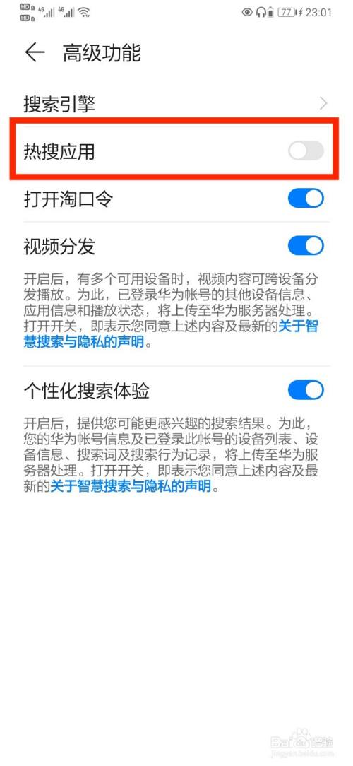 在高级功能设置页面,点击关闭【热搜应用】开关即可。如下图所示。