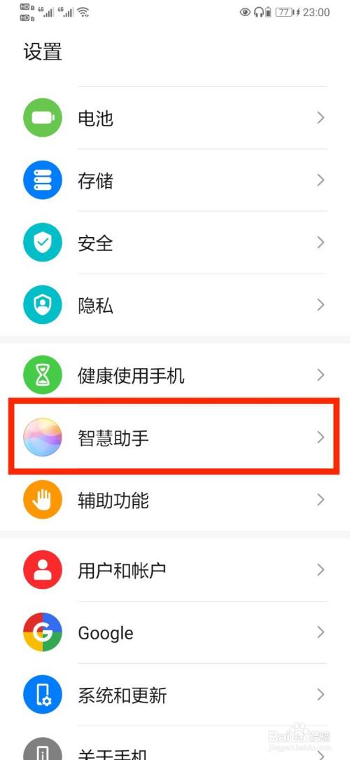 在华为设置页面,打开【智慧助手】,如下图所示。