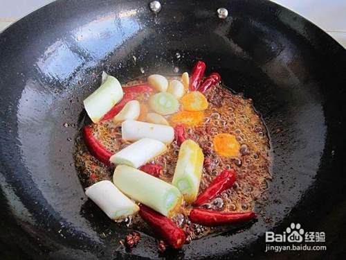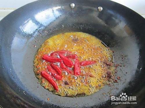 锅底留底油,加火锅底料翻炒出红油出香味,加花椒粒、辣皮子、八角爆出香味辣味