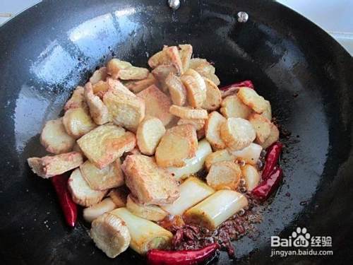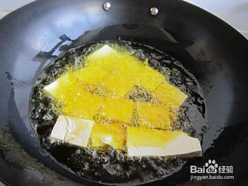 热锅凉油,油肉7成下豆腐炸到两面金黄色捞起。