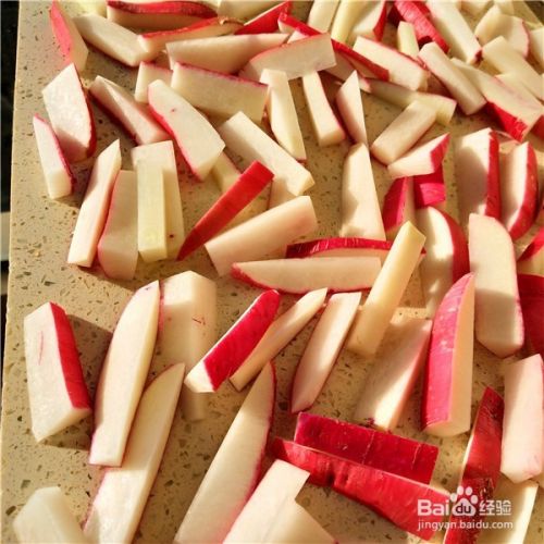 萝卜切成条状后,再平铺在干净的石板上放在阳光下晾晒。