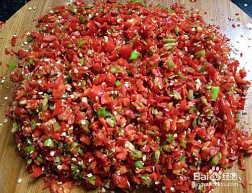 把晾干水分的辣椒用刀剁,也可以用料理机打碎,辣椒不要剁的太细,这样就可以