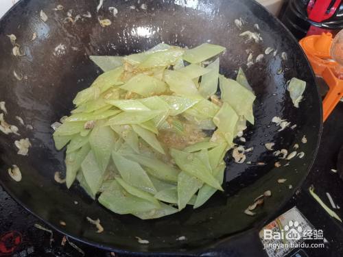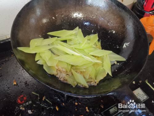 莴笋去皮后洗净,切成菱形块,然后下入锅中,用炒勺进行翻炒