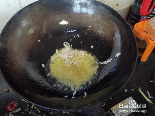 然后下入用说泡发后,沥干水分的虾皮,在锅中和油温一起快速翻炒,激发虾皮的海鲜味