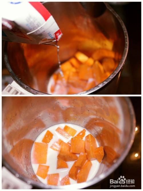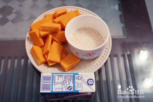 2. 把大米,南瓜,牛奶倒入豆浆机内。